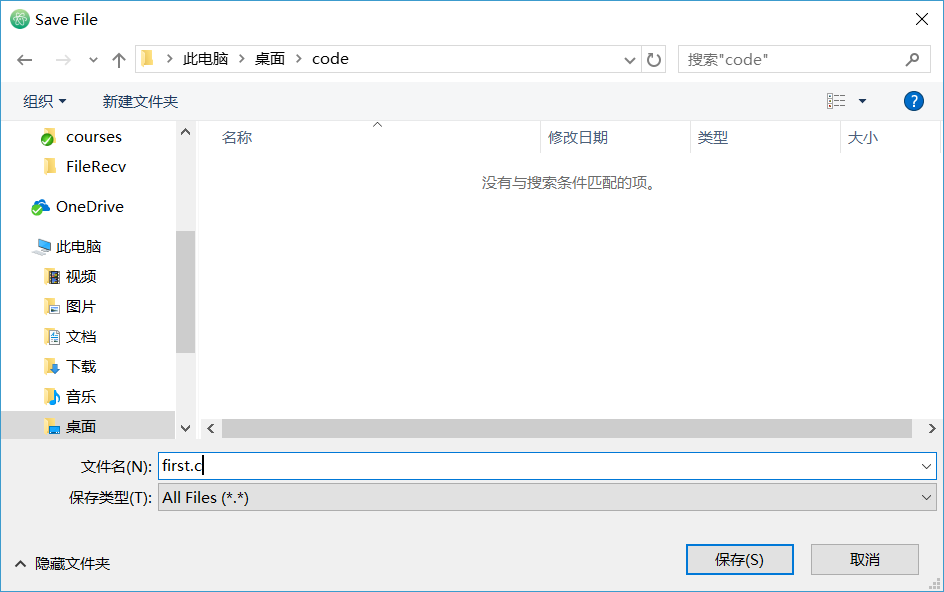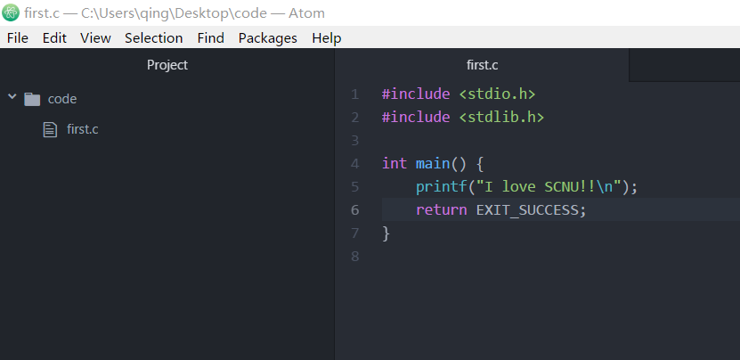 首先第一步还是先写写源代码,打开 Atom,点击菜单栏的 File > New File 新建一个文本文件,然后File > Save 定位到一个你想用来放代码的文件夹,文件名取一个后缀为 .c 的名字就好。