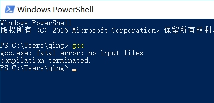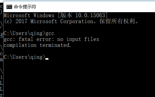 我们在里面输入 gcc 然后回车,如果返回了一个 fetal error: no input files 的错误提示的话,说明 gcc 已经装好并且可以使用了。