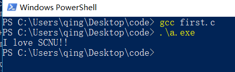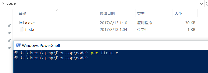 这时候我们运行 gcc 把 first.c 编译成 Windows 可用的可执行文件,命令很简单