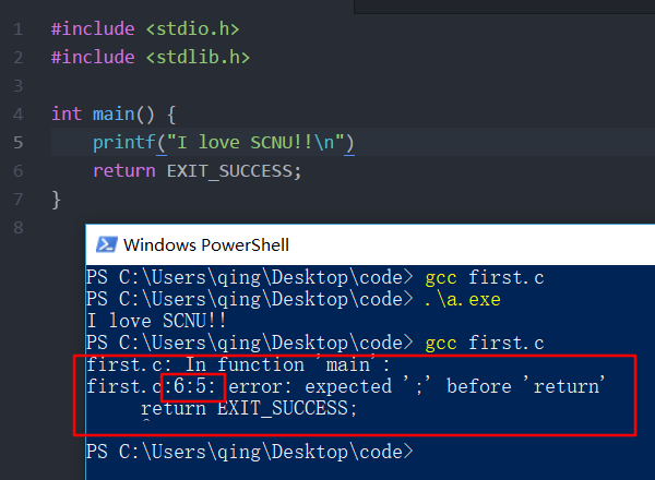 这里我故意把第5行最后的分号删掉,再运行 gcc 命令编译,提示第六行第五个字符的 return 之前少了分号,编译失败。